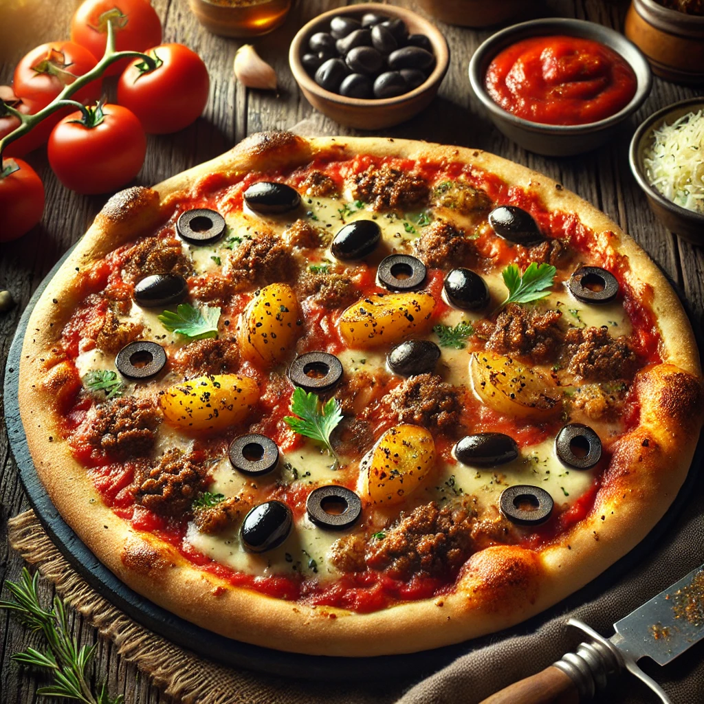 Sauce tomate,mozzarella, olives, viande hachée, pommes de terre