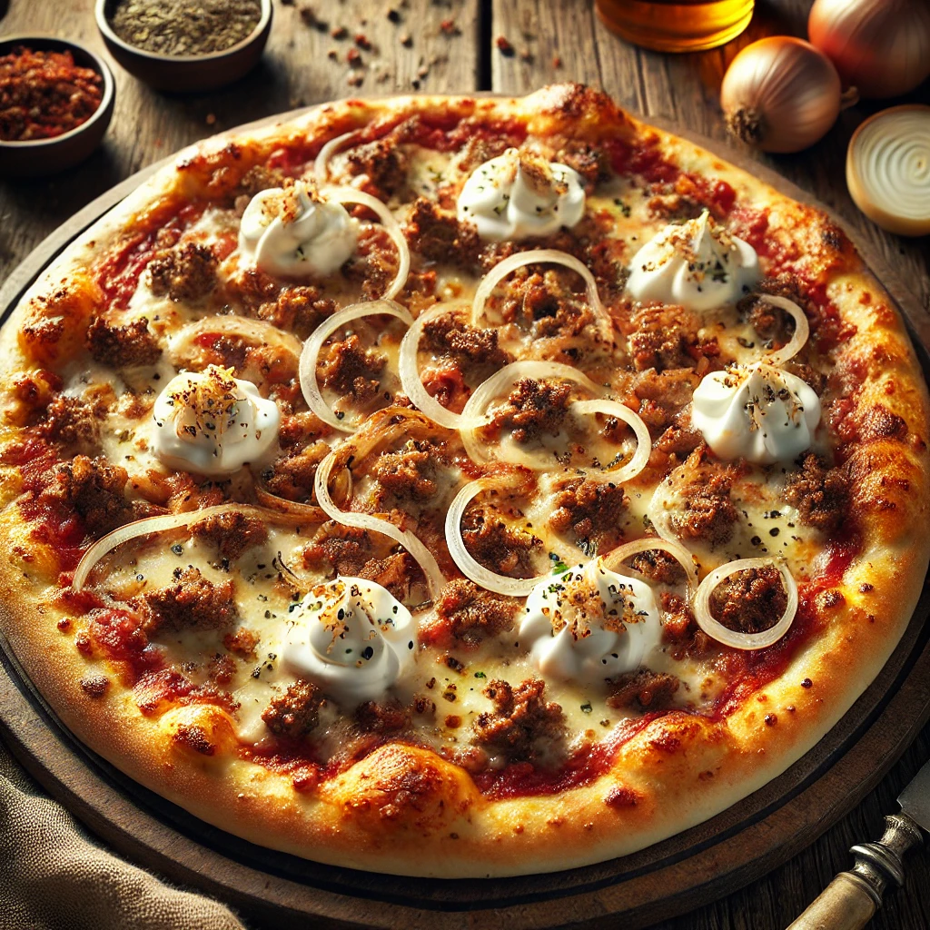 Sauce tomate,mozzarella, chorizo, jambon, bacon, lardons