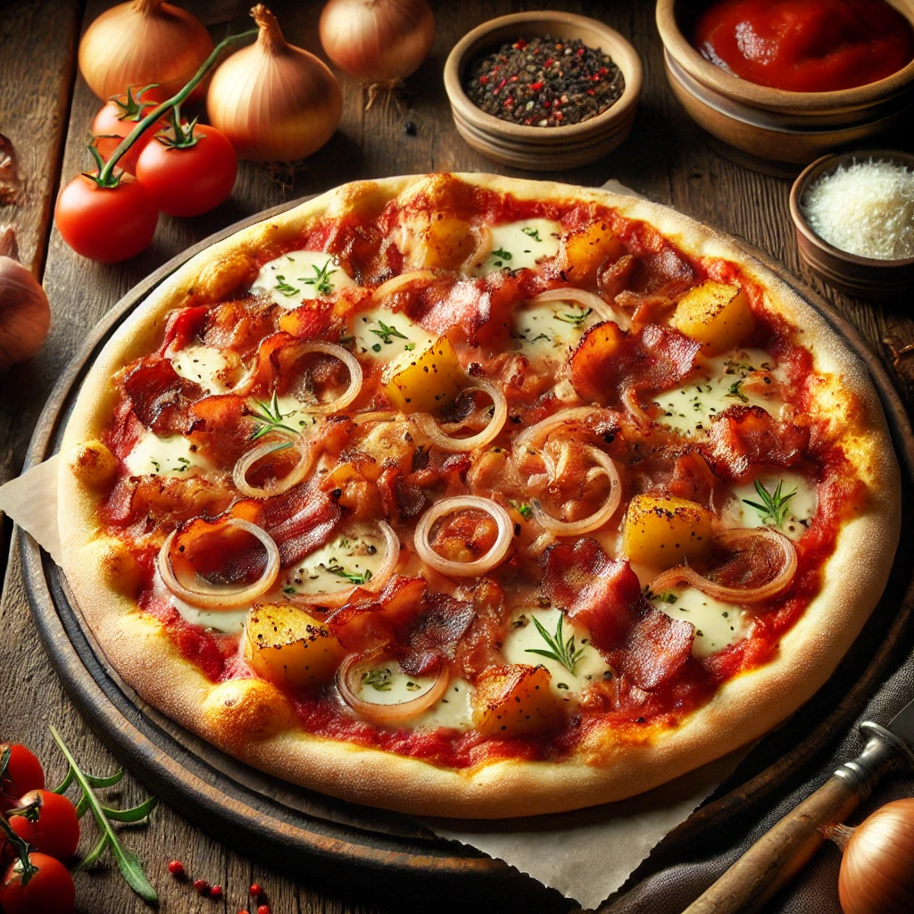 Sauce tomate,mozzarella, lardons, oignons, pommes de terre